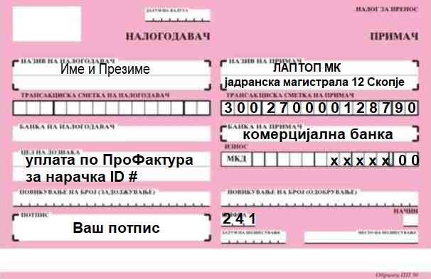 Laptop.MK овозможува практично и сигурно плаќање преку електронско банкарство со Општа Уплатница ПП30. Овој начин на плаќање им овозможува на купувачите лесно да извршат уплата од било која банка, онлајн или на шалтер.